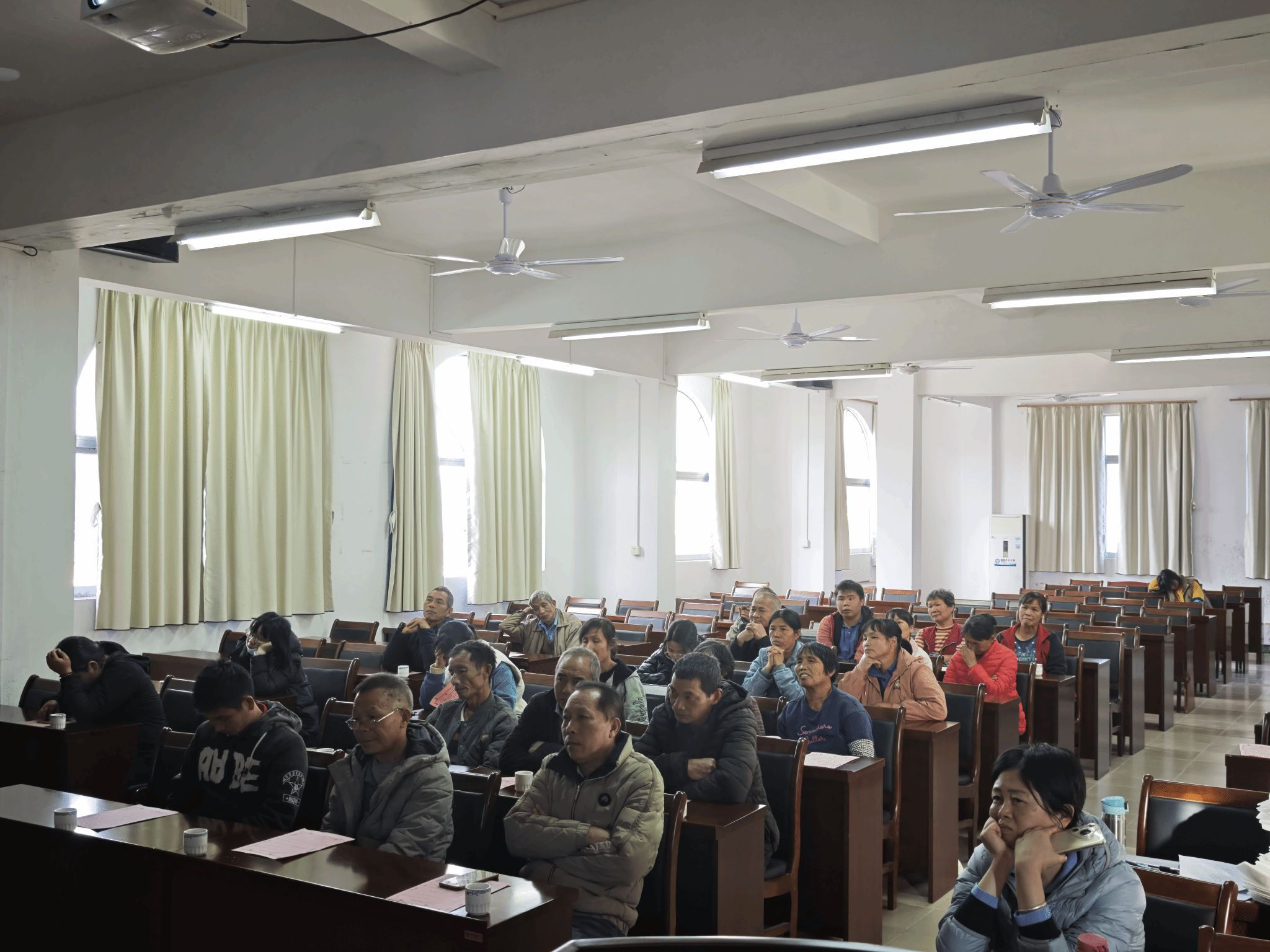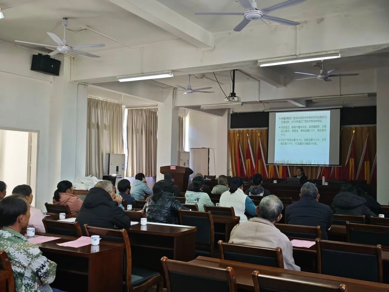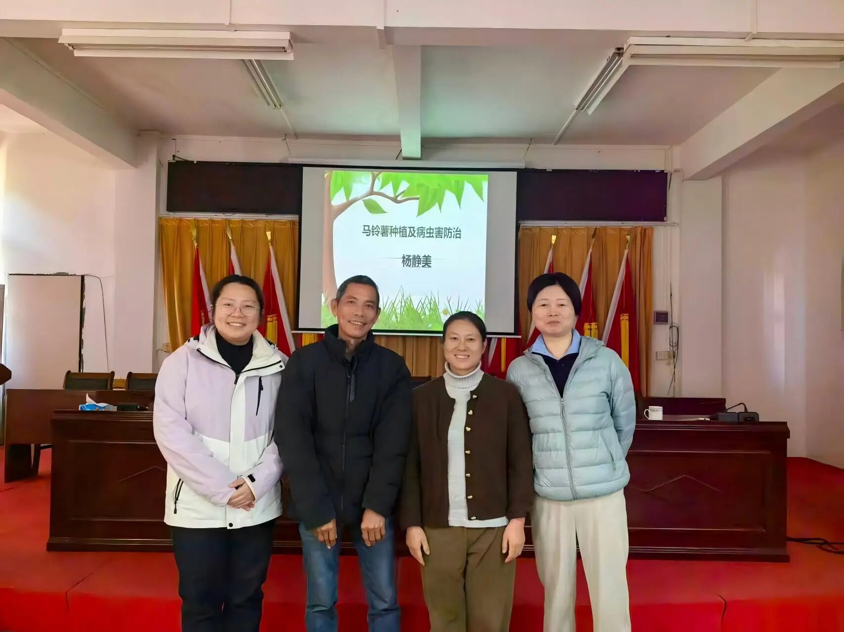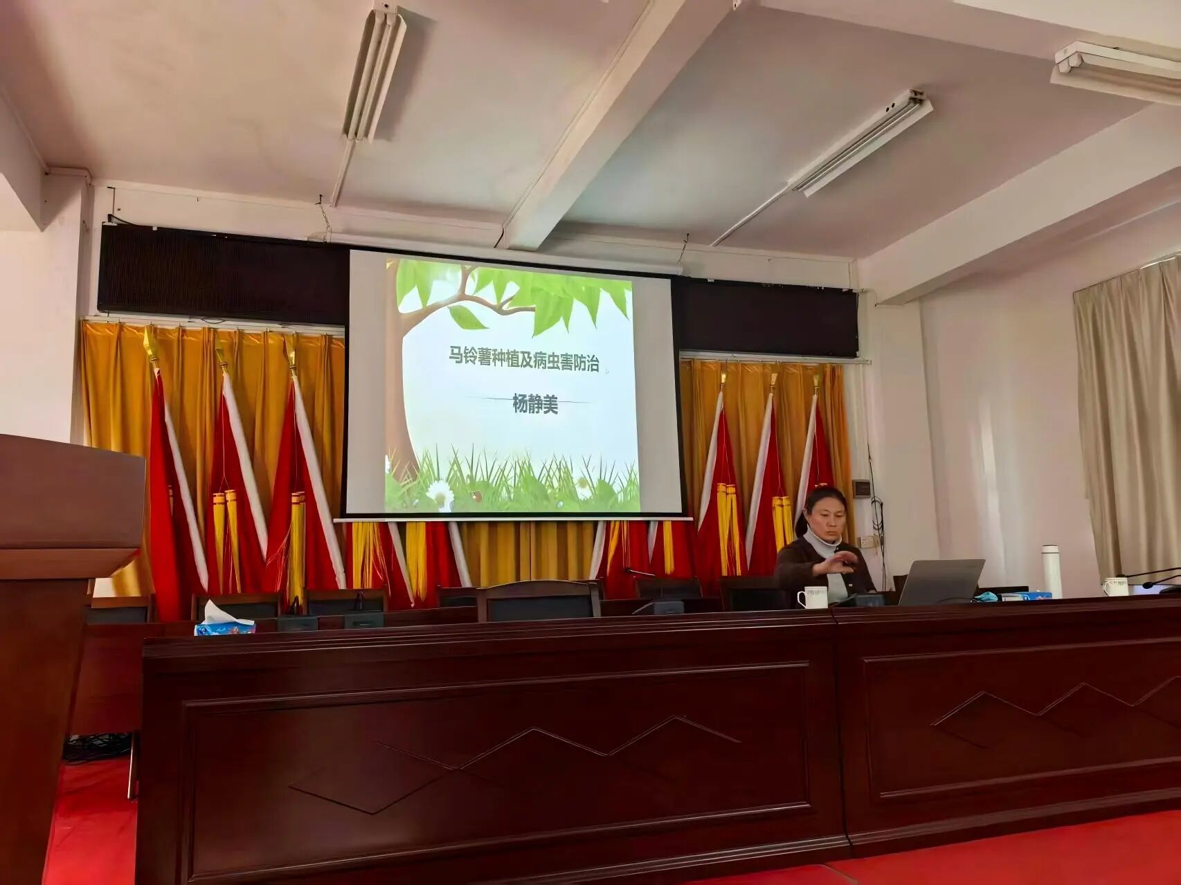会上,杨静美博士深入浅出地讲述了马铃薯产业的规模、种薯选择、切块、消毒、催芽、农田管理、病虫害等,干货满满。精彩且接地气的语言引得大家积极发言,会上气氛热烈,农户纷纷举起手机拍下种植要点。