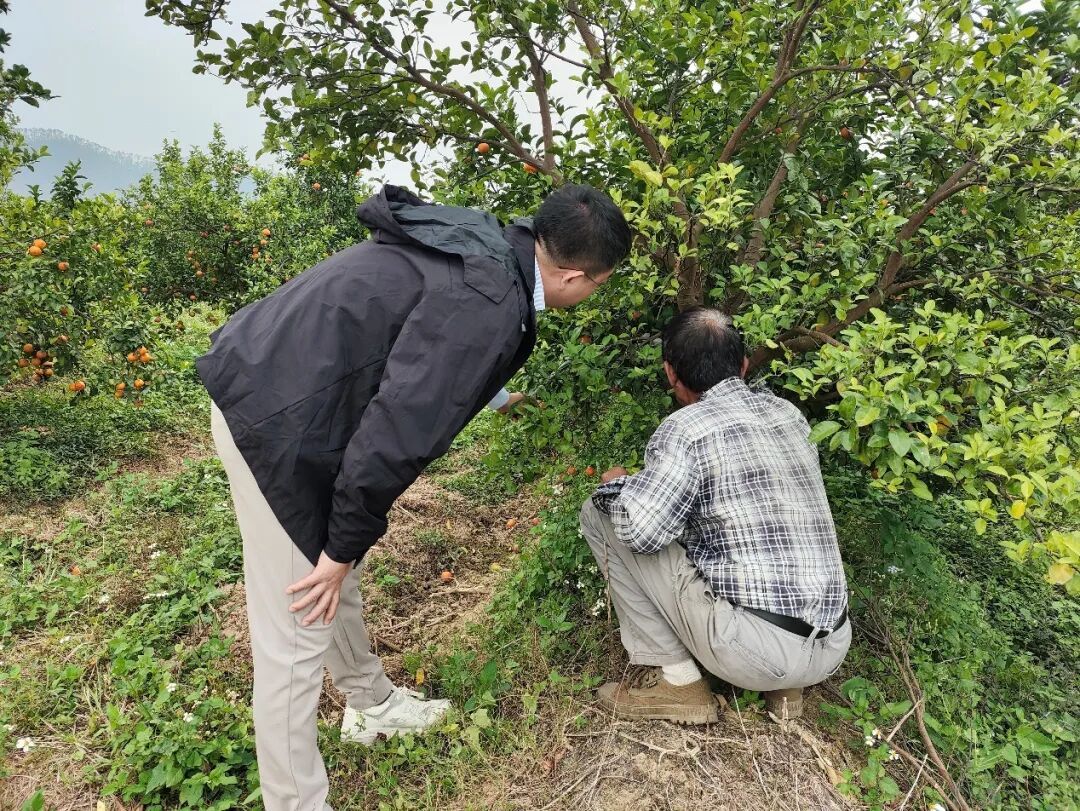 吴仲真深入田间,勘查了黄龙病的发生与分布。他现场向合作社农户及管理人员讲解黄龙病的危害特征、传播途径及防控关键。吴仲真指出,黄龙病虽具较强毁灭性,但并非不可防控,果农应树立“预防为主、综合防治”的科学发展理念。他强调,防控黄龙病必须抓住两个核心环节:一是严格防控传播媒介柑橘木虱,通过科学选药、统一防治时间、清理果园周边环境等方式,有效降低木虱数量,切断病害传播路径;二是坚决彻底清除染病植株,一经确认应立即挖除并进行无害化处理,避免病害扩散,保护健康果园。