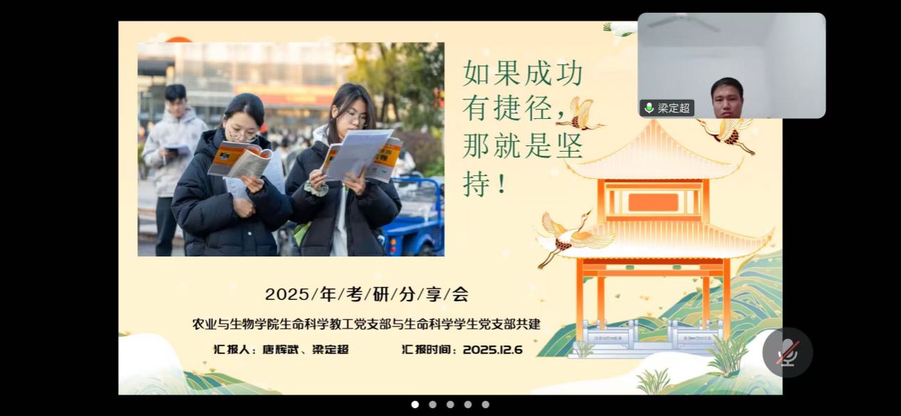 此次考研分享会是生命科学教工党支部与员工党支部结对共建的重要举措,既为考研学子提供了实用的应试指导和经验参考,也传递了党组织的关怀与支持。通过师生党支部联动,有效发挥了党建引领作用,为员工成长成才赋能。相信在党组织的助力下,考研学子们将以更自信的姿态迎接挑战,在考场上全力以赴,实现自己的升学梦想。