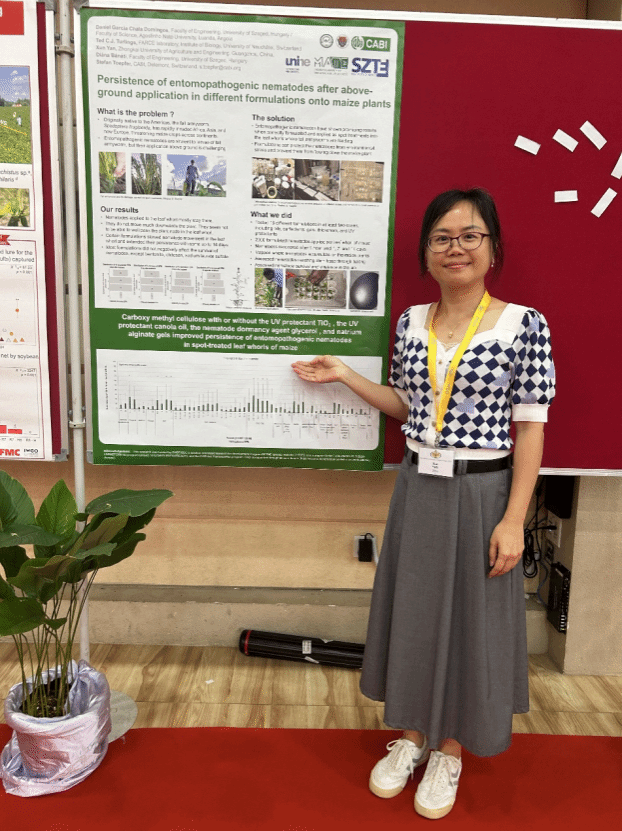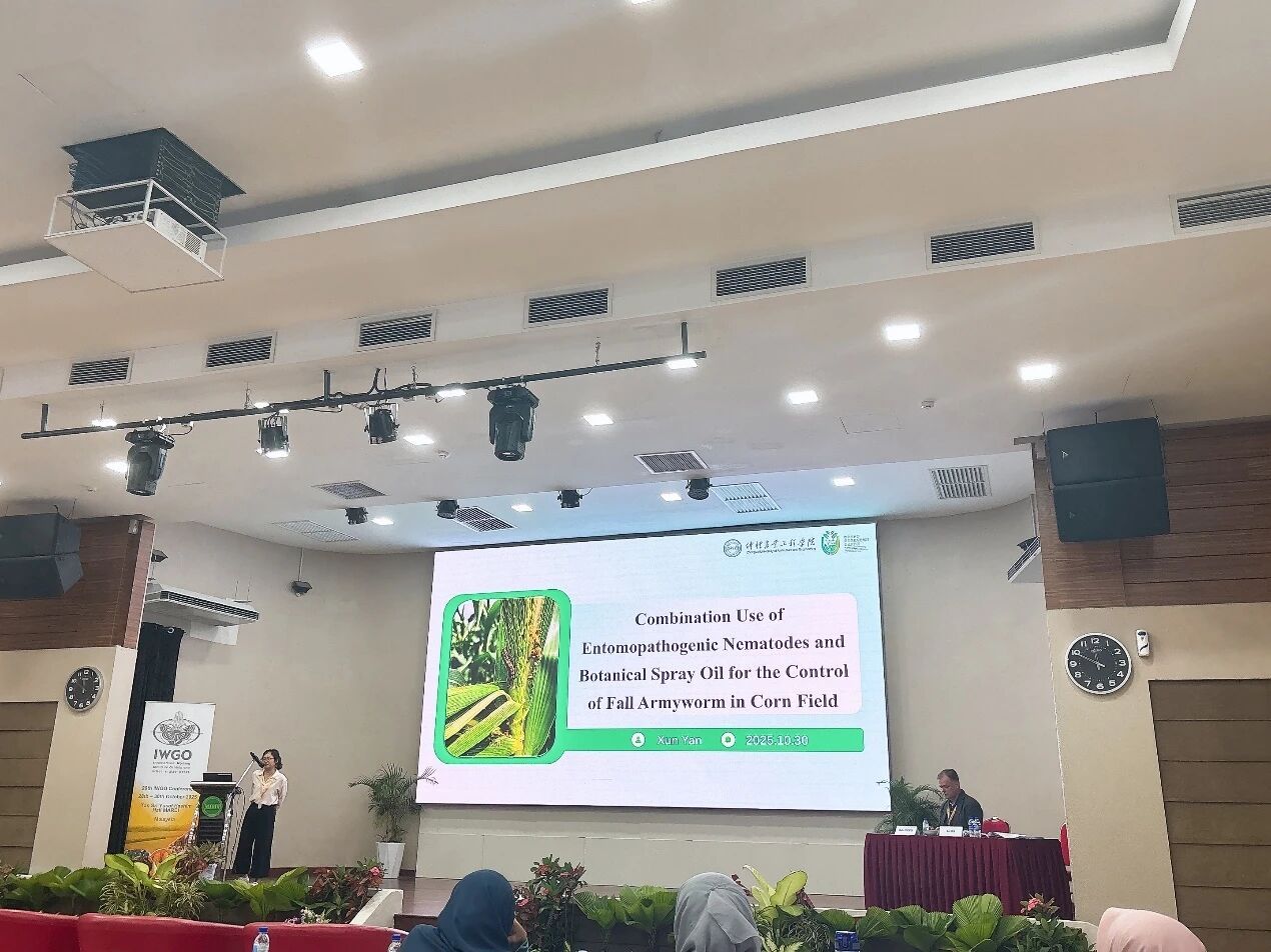 颜珣研究员通过口头报告与海报两种形式,展示了公司在利用昆虫病原线虫作为生物农药防控草地贪夜蛾的研究进展及国际合作成果。在海报展示环节,她介绍了不同剂型对昆虫病原线虫在玉米植株上持效性的影响,为针对草地贪夜蛾的昆虫病原线虫剂型研发提供了重要依据。在专题报告中,她重点汇报了昆虫病原线虫和农用植物油协同防治玉米地草地贪夜蛾的研究结果。该工作由公司已毕业硕士研究生丁倩带领农学专业2021级本科员工共同完成,初步建立了生防因子联合应用的技术体系,为草地贪夜蛾的绿色、高效、低成本综合治理提供了可行方案。公司在昆虫病原线虫研发与应用方面的成果引起了与会学者的广泛关注。来自津巴布韦、菲律宾等国的学者在会期间积极交流,为后续国际合作奠定了良好基础。