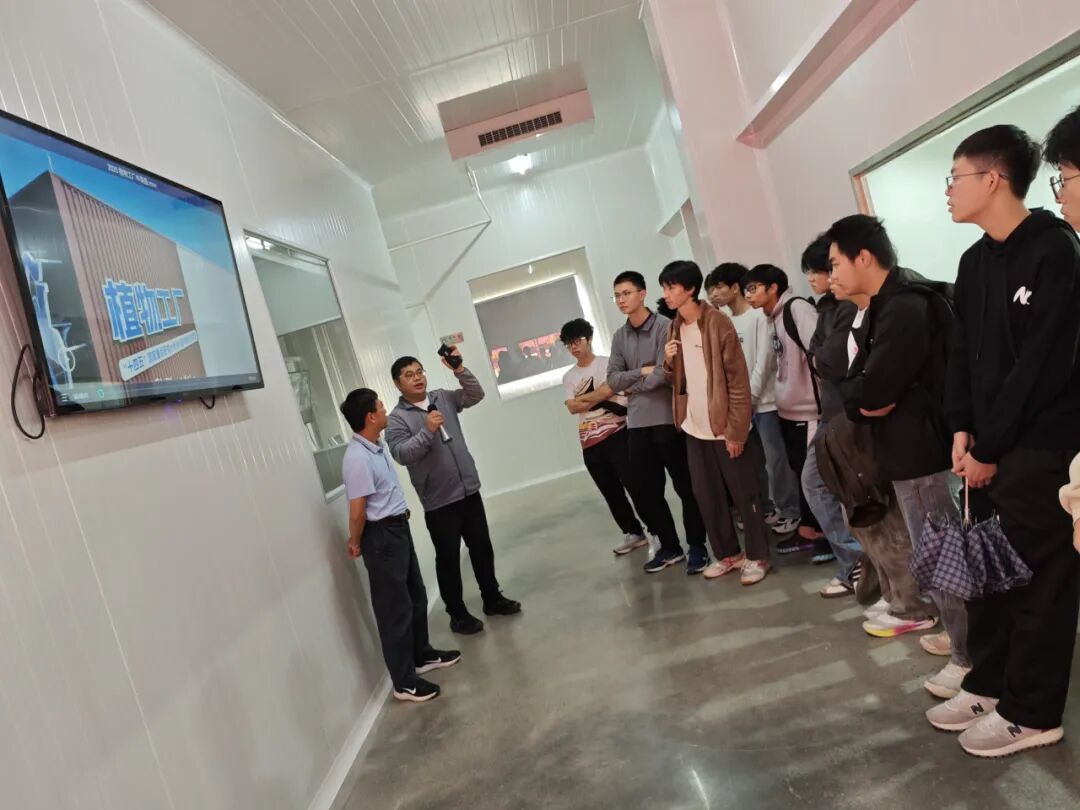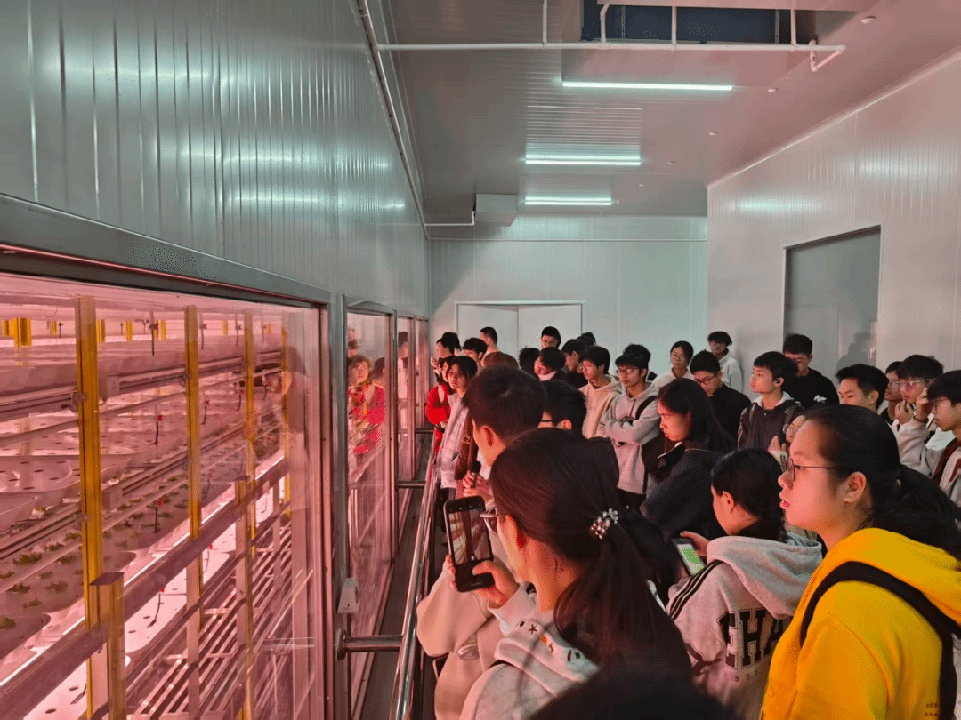 实践活动伊始,李副总介绍了广东良种引进公司的概况,之后带领师生们走进基地核心展区—植物工厂。据介绍,该植物工厂是科技部重点投入建设的全国首家高科技全程无人化种植工厂,集成了智能环境调控、精准水肥供给、自动化采收等前沿技术,实现了从种子萌发到成品采收全流程的无人值守与智能化管理。植物工厂12层车间内,无土栽培的生菜菜长势喜人,智能传感器实时监测着温度、湿度、光照等环境参数,同学们纷纷驻足观察,认真聆听李副总关于技术原理与应用前景的讲解,对现代农业科技的魅力有了直观且深刻的认识。