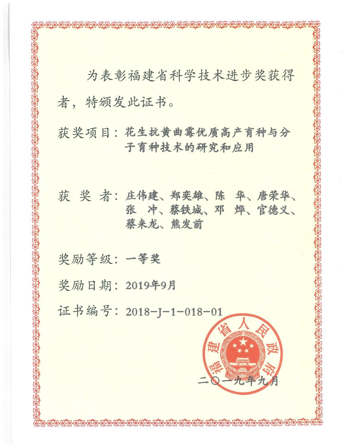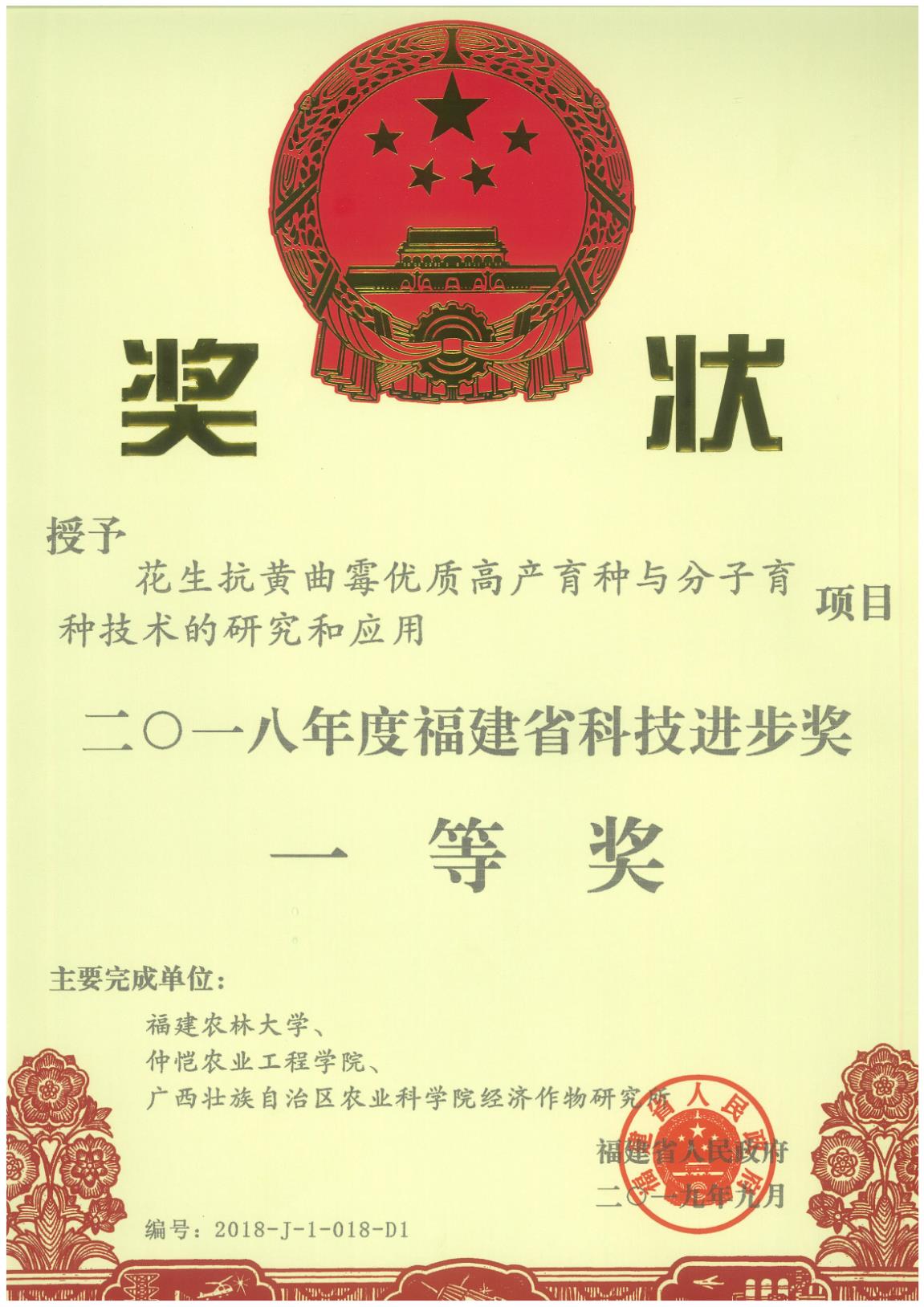 近日,公司参与完成的“花生抗黄曲霉优质高产育种与分子育种技术的研究与应用”,荣获二〇一八年度福建省科技进步奖一等奖。这是从日前福建省人民政府公布的2018年度省科学技术奖励名单上获悉的,该成果由福建农林大学、best365官方网站、广西壮族自治区农业科公司经济作物研究所共同完成,公司为第二完成单位、郑奕雄教授为第二完成人。