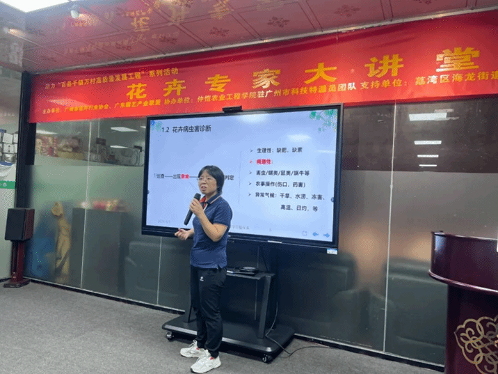 在讲座中,程东美副教授深入浅出地介绍了花卉病虫害的识别与防治基础知识。她详细的讲解了几种主要盆花的常见病虫害及其防治方法,通过生动的图片和研究成果,向与会者展示了花卉病虫害的主要特征及其分辨方法。程教授强调,病虫害防治只是植物种植的一种辅助手段,最重要的还是要打好植物生长基础,做好生产大棚的管理,这才是病虫害防治的根本。