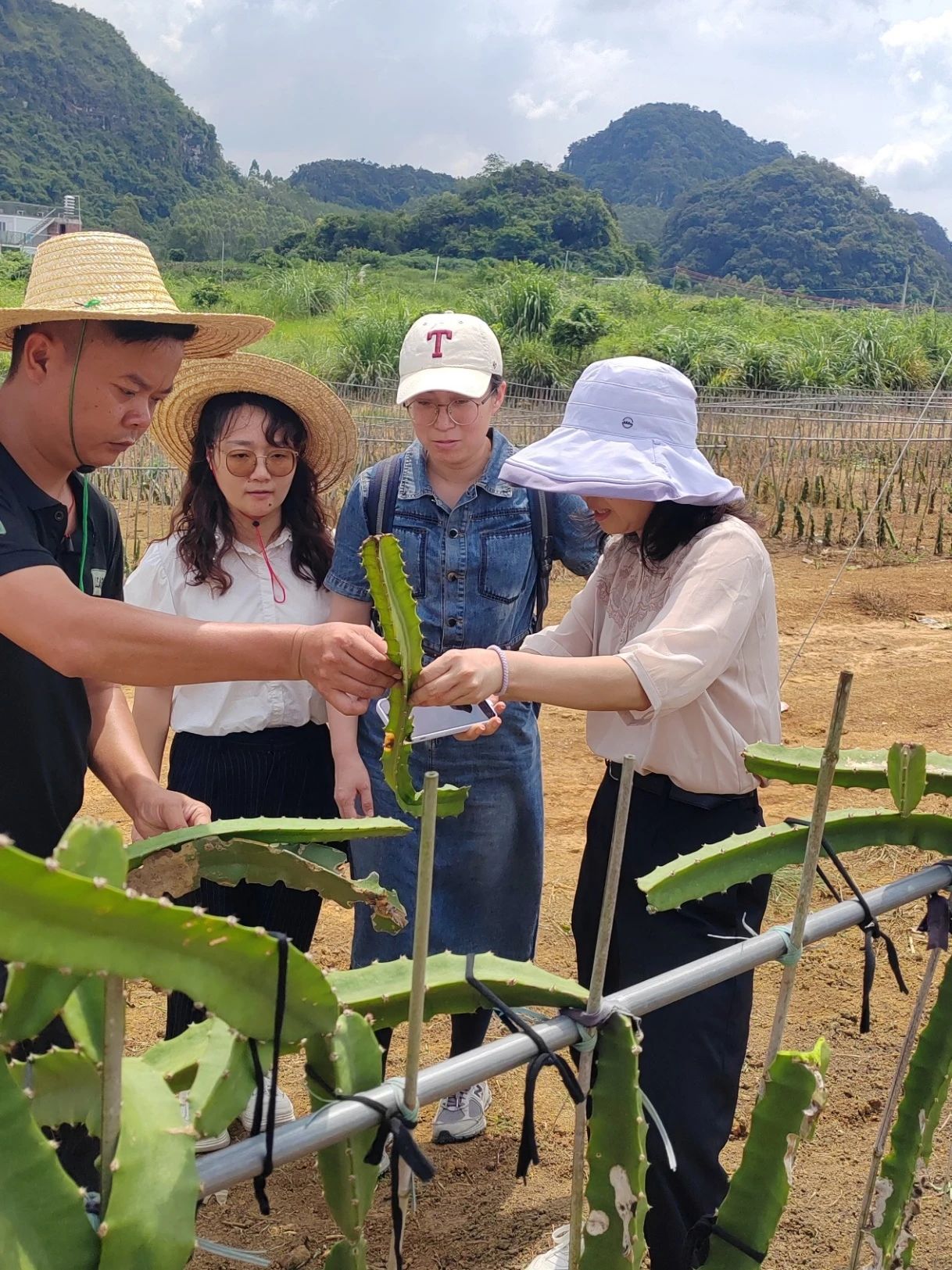 特派员团队先前往火龙果科技小院建设点,与金鸡镇驻镇帮镇扶村工作队队长及镇政府领导同志探讨并细化明确新一轮农村科技特派员帮扶工作具体任务。特派员团队随后在火龙果种植基地进行实地考察和调研,针对农户种植过程中出现白蚁防控不彻底、炭疽病易复发等问题,提供病虫害防控技术的指导,并将持续跟进技术指导服务,同时采集了火龙果带病标本回实验室做进一步的研究。