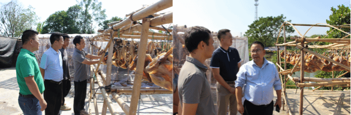 恩平市委常委、统战部部长何坚培,恩平市农业农村局党组书记、局长甄术强,那吉镇党委书记沈智慧一行与科技特派员团队深入那吉腊鸭加工作坊实地调研。腊鸭作为那吉的传统美食,承载着深厚的文化底蕴与乡愁记忆。那吉腊鸭制作技艺被列入恩平市第七批市级非物质文化遗产代表性项目名录。然而传统制作工艺面临的挑战日益凸显,如何在保持风味的同时,提升食品安全标准,让这一美味推向更广阔的市场,成为了急需解决的关键问题。