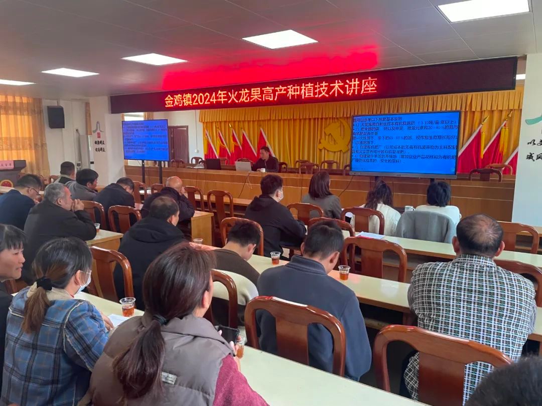 上午,科技特派员团队抵达罗定市金鸡镇后,与金鸡镇驻镇帮镇扶村工作队队长叶丽平等同志在金鸡镇人民政府会面,就金鸡镇火龙果产业最新发展状况进行交流。针对金鸡镇火龙果产业发展现状,科技特派员在金鸡镇人民政府多媒体培训室为乡镇干部及种植户开展相关技术培训。颜珣研究员开展火龙果主要病虫害及综合防控技术培训讲座,对火龙果品种、种植技术、常见病虫害种类、病虫害综合防控方法及注意事项等进行了系统详细的讲解,并将综合防控及绿色农业的理念传播给在场的培训人员。团队邀请了新兴县绿丰优果农业科技有限公司孔林发开展火龙果高产种植技术培训讲座,从火龙果丰产栽培管理要点入手,带领村民学习相关管理方法与技术操作,图文并茂,通俗易懂,为火龙果种植户农业生产实践提供了扎实的理论支持与技术保障。