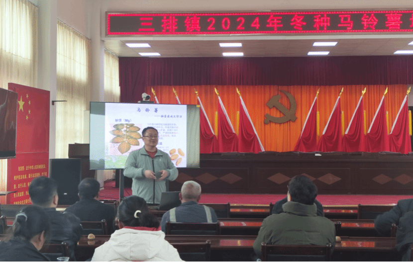 27日上午,驻三排镇帮扶工作队及各村种植户等30余人参加了马铃薯冬种技术培训会,best365官网入口注册蒋锋副教授进行授课,三排镇综合事务中心孙清昊同志主持培训,三排镇驻镇工作队陆主任发言动员。培训中,蒋教授紧紧结合三排镇的地理位置特点与实际生产情况,围绕马铃薯高产高效栽培技术进行了生动形象地讲解。讲解过程中,蒋教授不仅使用了丰富的案例和数据,还结合具体生产场景进行了实操要点的解析,让参训农户更容易理解和掌握相关技术。培训结束后,蒋教授积极与参训农户面对面交流,耐心倾听种植户在实际生产中遇到的问题,并结合理论知识和自身经验,为大家提供了针对性的解决方案。参训农户纷纷表示,本次培训内容充实、实用性强,为马铃薯种植生产实践提供了扎实的理论支持与技术保障。