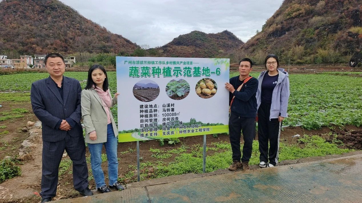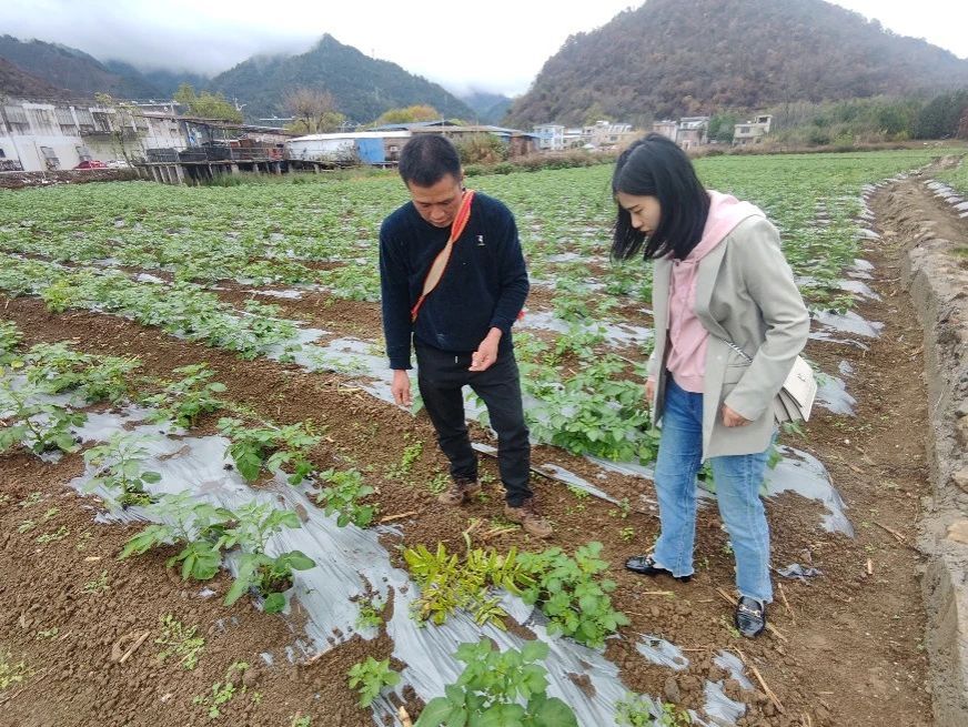 在驻南岗村第一书记陆景的陪同下,特派员团队先后考察了南岗村瑶家大院民俗文旅项目、石墨公园南瓜种植基地及山溪村家庭农场蔬菜示范基地。在山溪村蔬菜种植基地,团队重点调研冬种马铃薯的生长情况。当前马铃薯已进入块茎形成关键期,整体长势良好,但巡查中发现部分植株出现叶片黄化、茎秆腐烂症状。支庆庆博士结合病害特征分析,初步判定为晚疫病侵染,建议立即清除病株并喷洒烯酰吗啉等高效杀菌剂,同时加强田间排水与通风管理,阻断病害扩散链条。