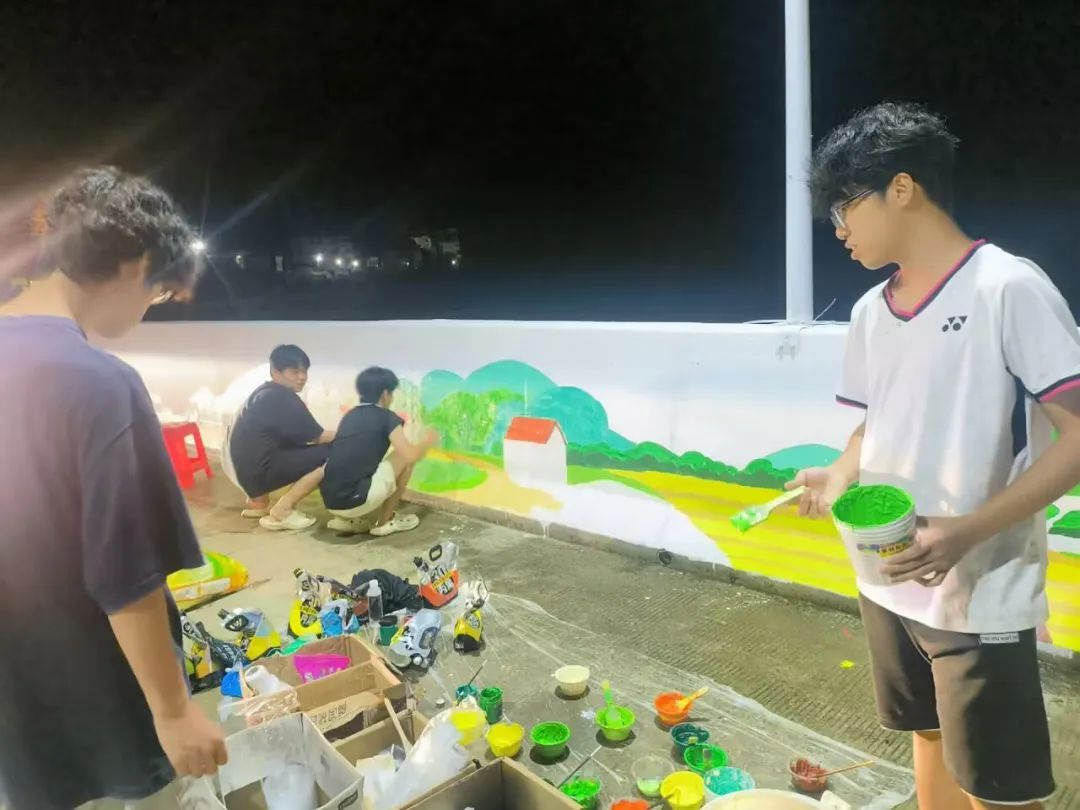 冒着大暴雨,杨静美博士一行驱车前往隆街镇双头村。抵达当天晚上,来不及卸下满身的疲惫,杨静美团队在驻村书记梁浩欣、村委赖罗圆的陪同下,来到双头村桥头,开展桥绘工作。梁书记介绍说,该桥位于双头村入口处,是前往双头村的必经之路。杨静美博士注意到,这座桥长约50米,桥两边已经刷白,只等员工来大展拳脚。摆好投影仪,员工就开始发挥他们专业的水准了。他们将事先绘画好的桥绘图按比例投放到桥上,然后进行描绘。对于夜晚在桥上绘画,不少村民感到非常稀奇。杨静美团队解释说,由于投影只能在晚上才能投放清晰,所以只能晚上叫员工开工,待描绘好图案,第二天就可以进行涂色了,比起直接描绘,效率大幅度提升。