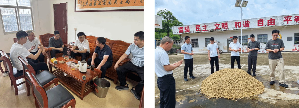 8月1日上午,杨永博士一行下沉基层一线,来到位于鹤塘村的黑花生、黑米示范基地,实地调研引种试种效果。村党支部书记张乔先陪同调研,介绍示范基地的运行情况,重点提到黑花生的种植情况。根据前期的多次种植观察,特派员团队从云南引进的黑花生品种表现非常突出,产量明显高于本地传统品种,籽粒饱满均匀,色泽黑亮,商品性极佳,并且抗病性、抗逆性(如耐旱性)表现优异,大大减少了管理成本和种植风险。通过实地考察和调研,特派员和工作队也一致表示,黑花生喜获丰收,特色种植显潜力,未来将持续助力鹤塘村黑花生产业的发展。