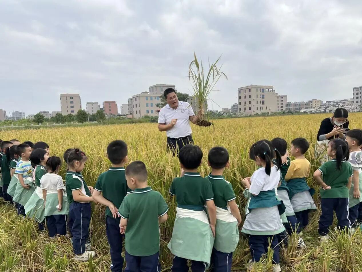 在汕头市鑫雄种植有限公司晚稻种植基地,仙城镇第一幼儿园的小朋友在老师们的带领下开展秋季研学活动,小朋友们一边轻抚水稻穗,观察稻穗的形态特征,一边感受稻田收割丰收的喜悦。陈青春老师站在水稻田,拿着一株成熟的稻穗,为小朋友介绍了水稻是如何从一粒种子变成众多沉甸甸的稻穗,从节气农事到收割储藏,为小朋友上了一场别开生面的丰收课。