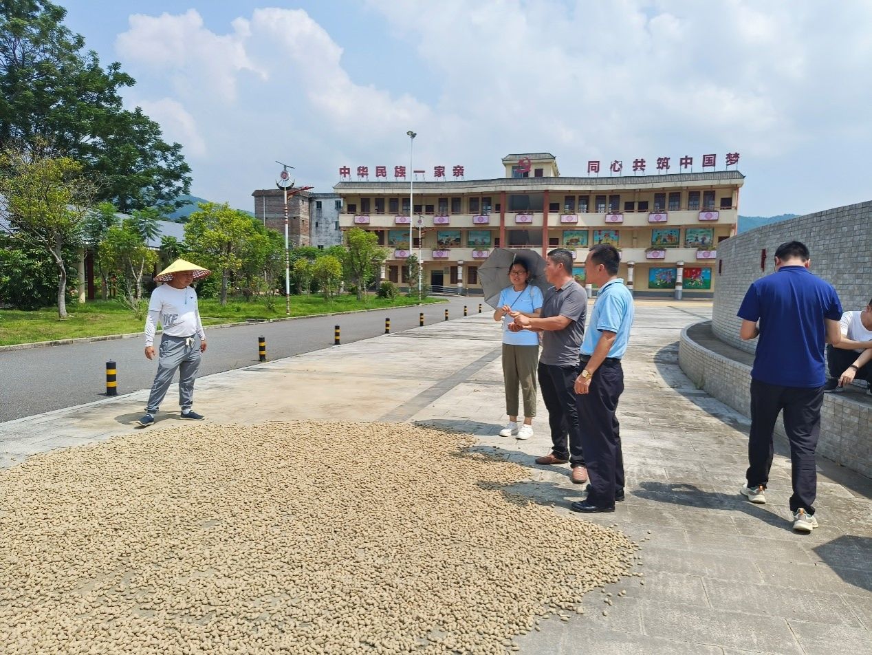 首先,驻镇帮扶工作队队员、驻黄翰村第一书记高海波带队前往花生晒场、甘薯种植基地调研。在民族团结广场,广东省大豆和油料产能提升工程花生专家指导组成员谢永平高级农艺师抓起一把花生仔细检查,非常欣慰地表示,今年春季生产的花生粒粒饱满、籽仁品质上乘,取得良好的效果;只是亩产偏低,下一步应着重加强产量的提高,这批花生晒干后可以留作秋种种子。在甘薯种植基地,强调一定要控制住杂草,方能有好的收成。