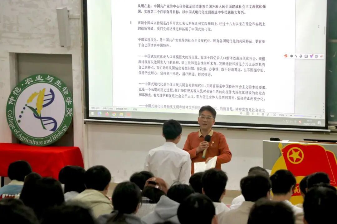 随后,培训班第一课开讲,周超雄书记以“以中国式现代化推进中华民族伟大复兴——学习贯彻党的二十大精神”为主题授课。他紧扣党的二十大报告核心要义,从马克思主义中国化时代化的新境界切入,深刻阐释了“两个结合”的历史成就、重大意义与实践路径,系统解读了习近平新时代中国特色社会主义思想中“十个明确”“十四个坚持”“十三个方面成就”的丰富内涵与内在关联,帮助学员理清理论脉络、把握思想精髓。