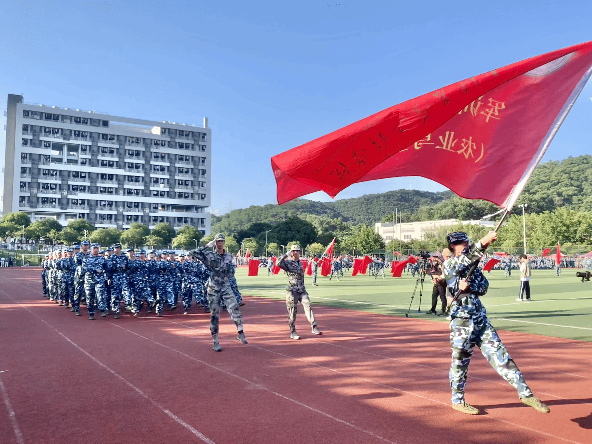 在军训期间,虽说在这⼏,同学们都⾮常的劳累,反反复复做着同样的动作,但是同学们收获颇丰,我们⽤实力证明,我们是有意志力的、有坚定信念的、合格的仲恺新生。