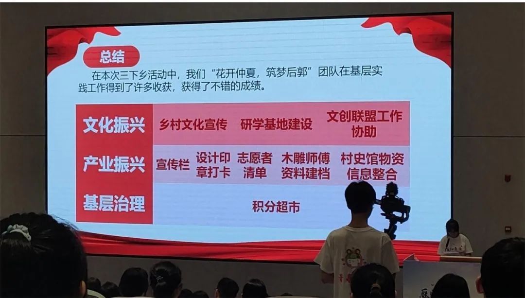 在“百千万工程”突击队及“三下乡”社会实践团队优秀示范项目成果展示环节中,“花开仲夏,筑梦后郭”暑期“三下乡”社会实践团是第一个进行汇报的团队,队长best365官网入口注册种科211班邱丹妍同学代表团队从文化振兴、产业振兴和基层治理三个方面介绍了团队在龙湖镇后郭村的实践工作。她通过图文和视频的形式,充分展示了团队在过去一个月里所取得的实践成果。