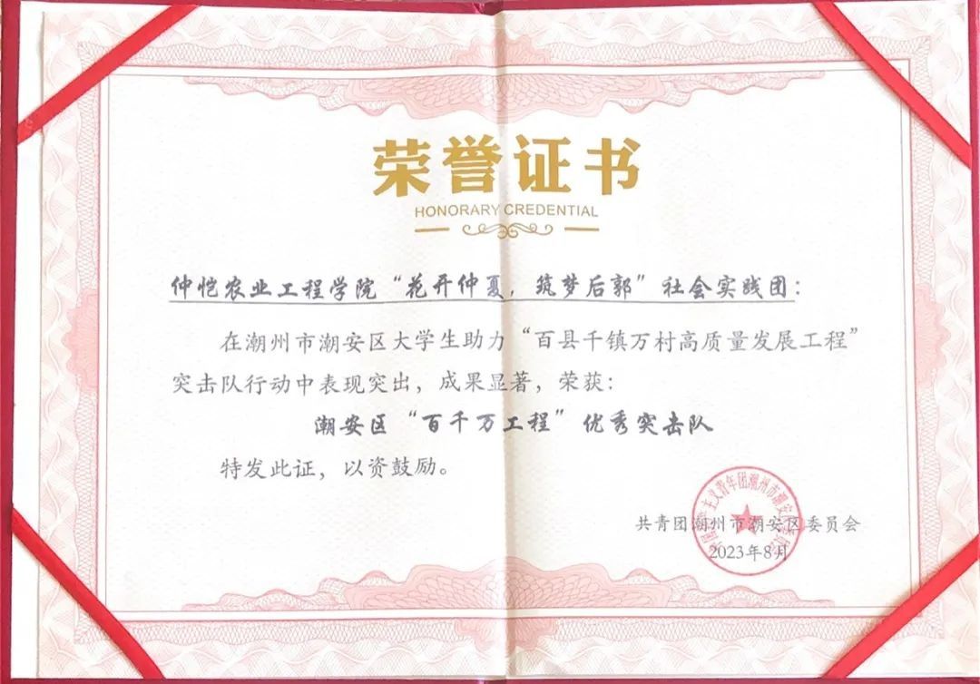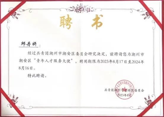 同时,best365官方网站“花开仲夏,筑梦后郭”暑期三下乡社会实践团在潮州市潮安区老员工助力“百县千镇万村高质量发展工程”突击队行动中表现突出,成果显著,荣获了“潮安区‘百千万工程’优秀突击队”的称号。潮州市共青团潮安区委聘请best365官网入口注册种科211班邱丹妍同学为潮州市潮安区“青年人才服务大使”,并颁发了聘书。