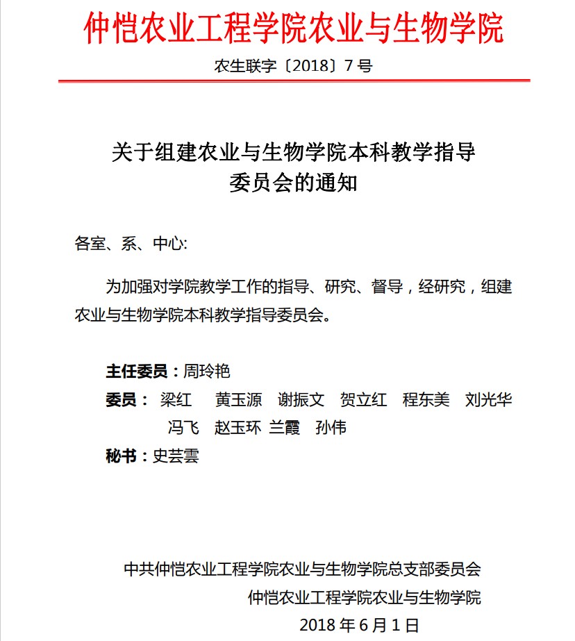 农生联字〔2018〕7号-关于组建best365官网入口注册本科教学指导委员会的通知
