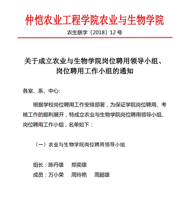 农生联字〔2018〕12号-关于成立best365官网入口注册岗位聘用领导小组、岗位聘用工作小组的通知