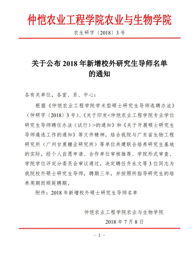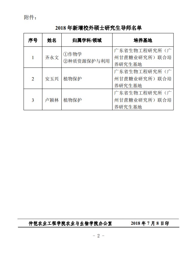 农生研字(2018)3号-甘蔗所-关于公布2018年新增校外研究生导师名单的通知
