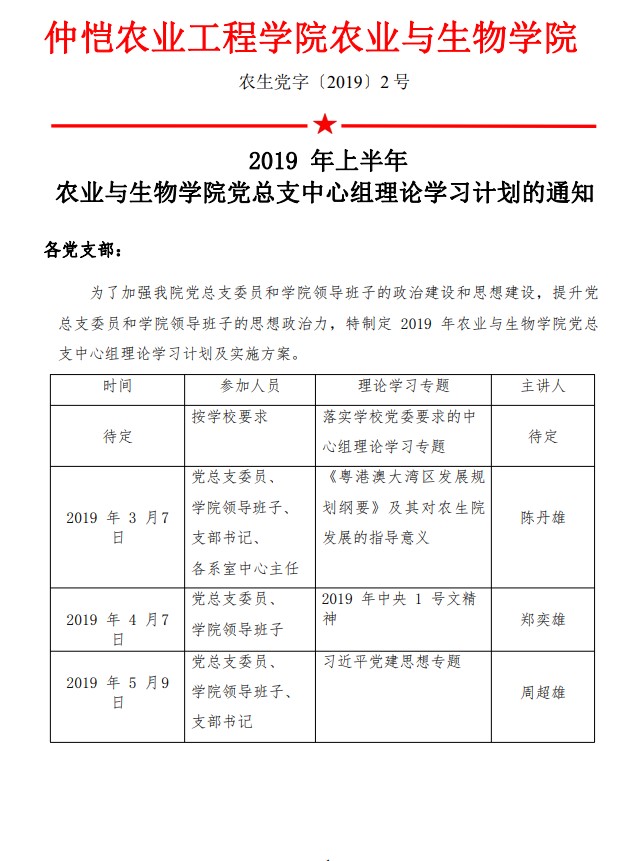 农生党字〔2019〕2号-2019年上半年农业与生物公司党总支中心组理论学习计划的通知