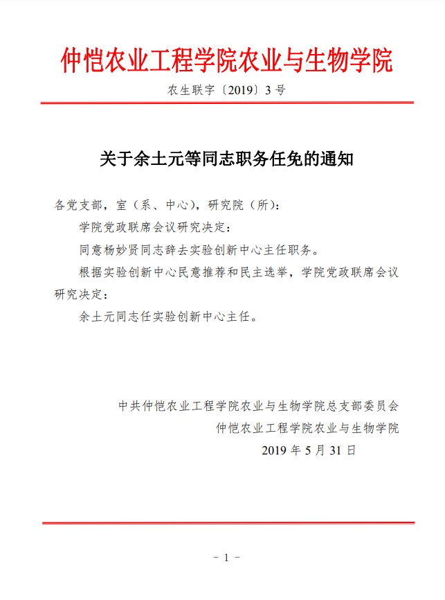 农生联字〔2019〕3号-关于余土元等同志职务任免的通知