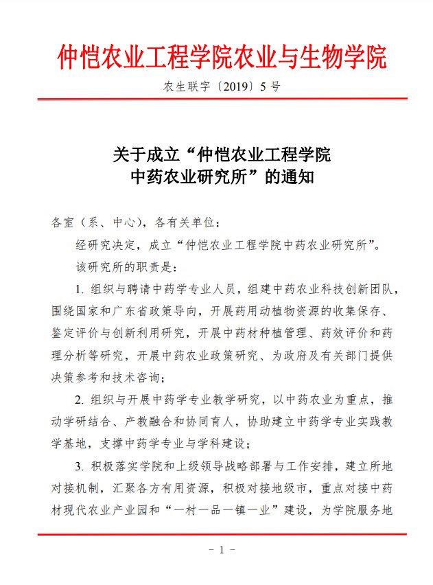 农生联字〔2019〕5号-关于成立best365官方网站中药农业研究所的通知
