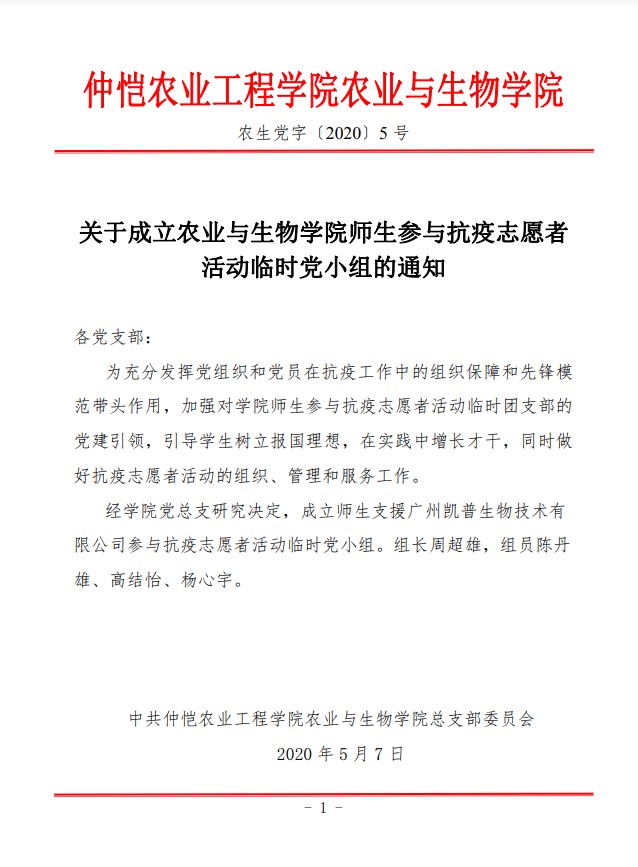 农生党字〔2020〕5 号-关于成立best365官网入口注册师生参与抗疫志愿者活动临时党小组的通知