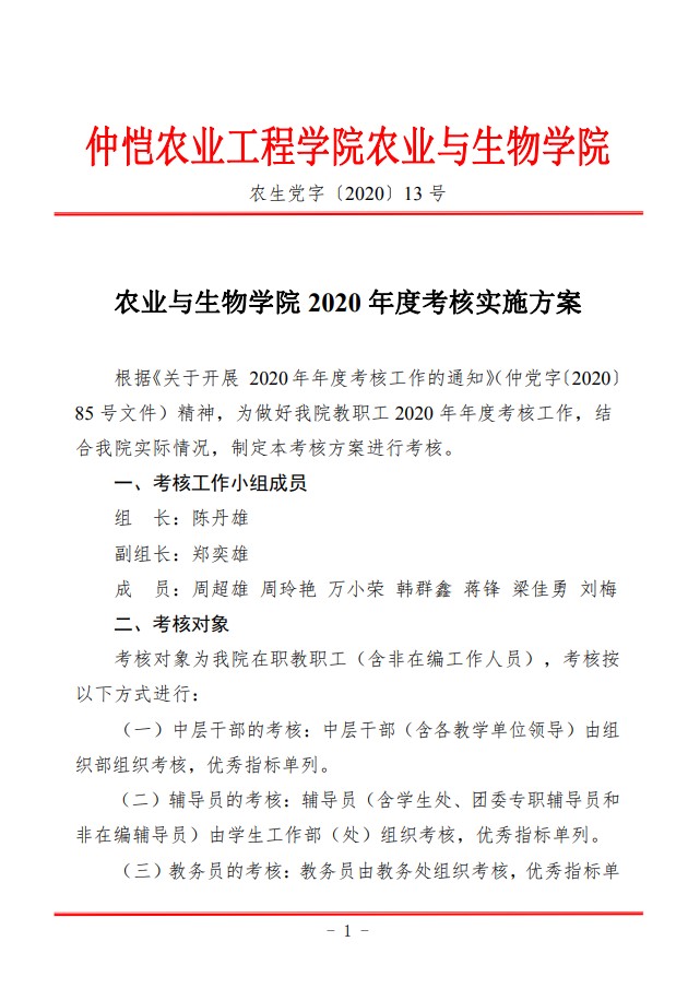 农生党字〔2020〕13号-best365官网入口注册2020年度考核实施方案