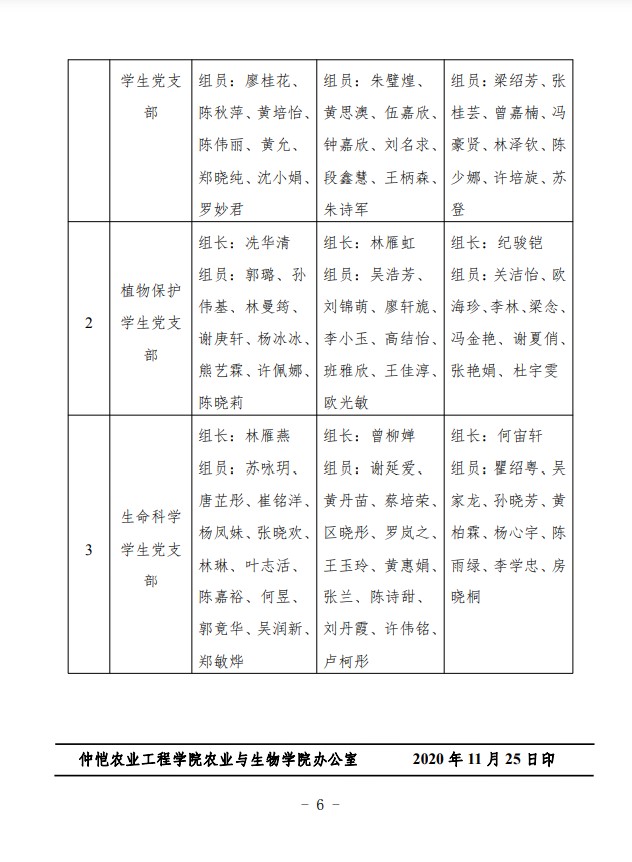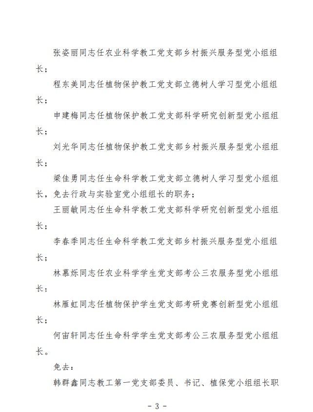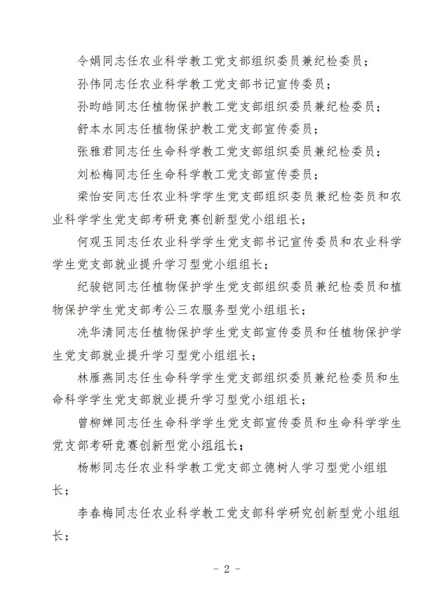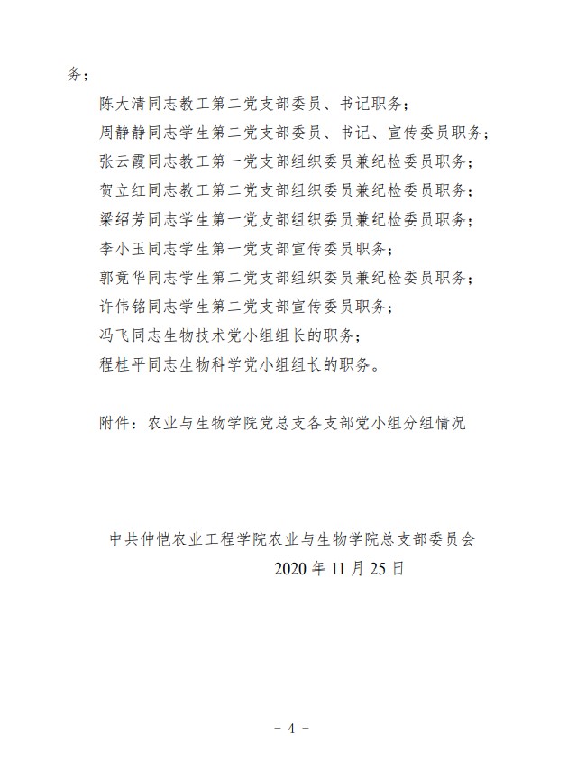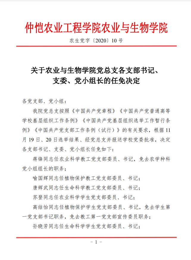 农生党字〔2020〕10号-关于农业与生物公司党总支各支部书记、支委、党小组长的任免决定