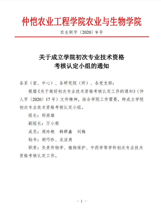 农生联字〔2020〕9号-关于成立公司初次专业技术资格考核认定小组的通知