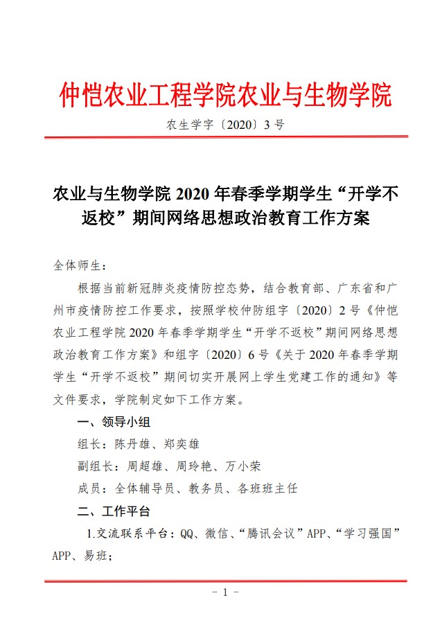 农生学字〔2020〕3号-best365官网入口注册2020年春季学期员工“开学不返校”期间网络思想政治教育工作方案