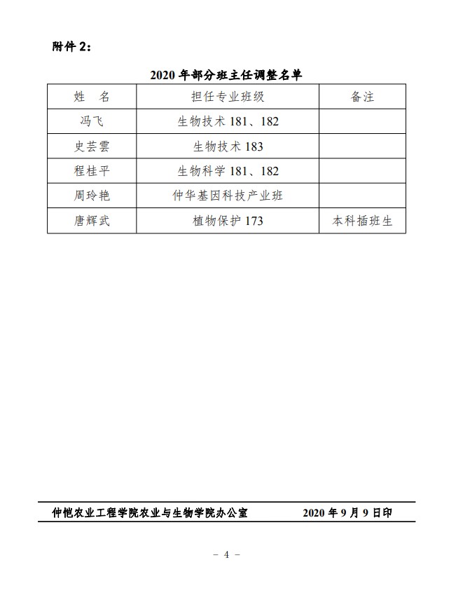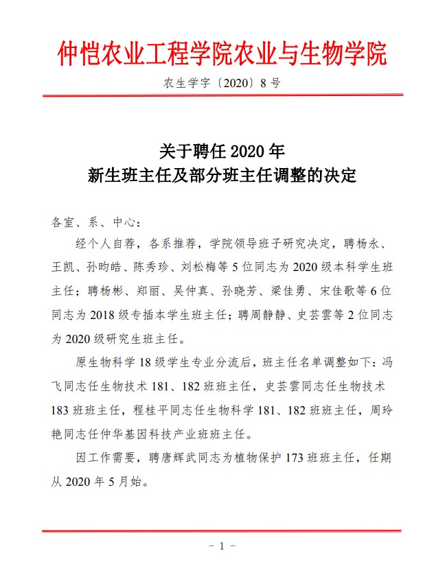 农生学字〔2020〕8号-关于聘任2020年新生班主任及部分班主任调整的决定