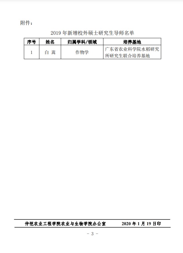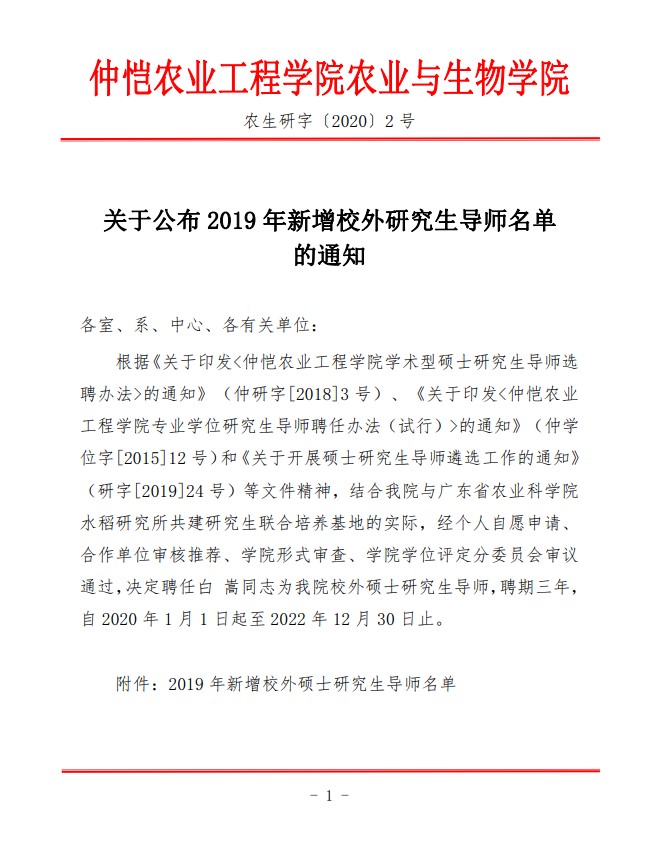 农生研字〔2020〕2 号-关于公布2019年新增校外研究生导师名单的通知(1)
