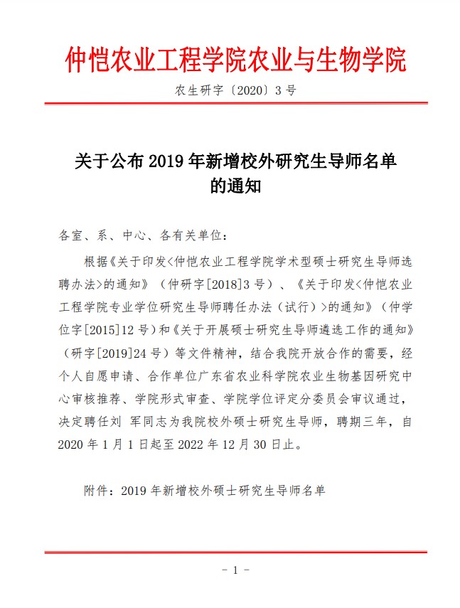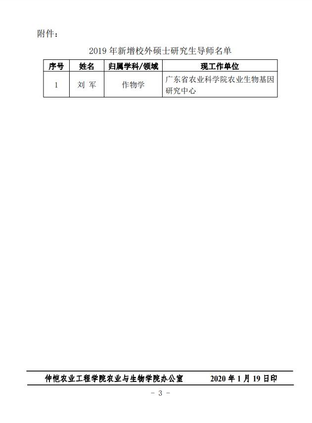 农生研字〔2020〕3 号-关于公布2019年新增校外研究生导师名单的通知(1)