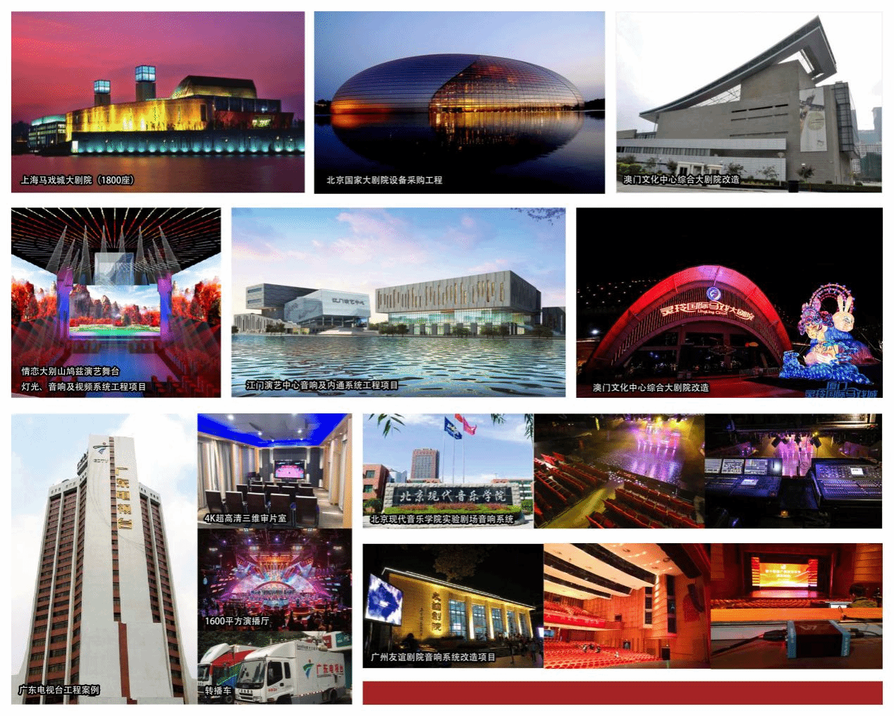 自林海彬成立公司至今,先后承接了北京国家大剧院、湖州大剧院、广州中山纪念堂、星海音乐公司、星海音乐厅、四川都江堰体育馆、广东电视台、广州广播电视台、中山电视台、北京战友文工团、湖南歌舞剧院、广东舞蹈公司、深圳音乐厅、江门演艺中心、澳门文化中心综合大剧院改造、湖南省歌剧院、广州大剧院音频系统、顺德演艺中心灯光、灵玲国际马戏团、顺德华侨城、阳春市工人文化剧院、广东民族乐团录音棚系统、音响系统工程项目等。