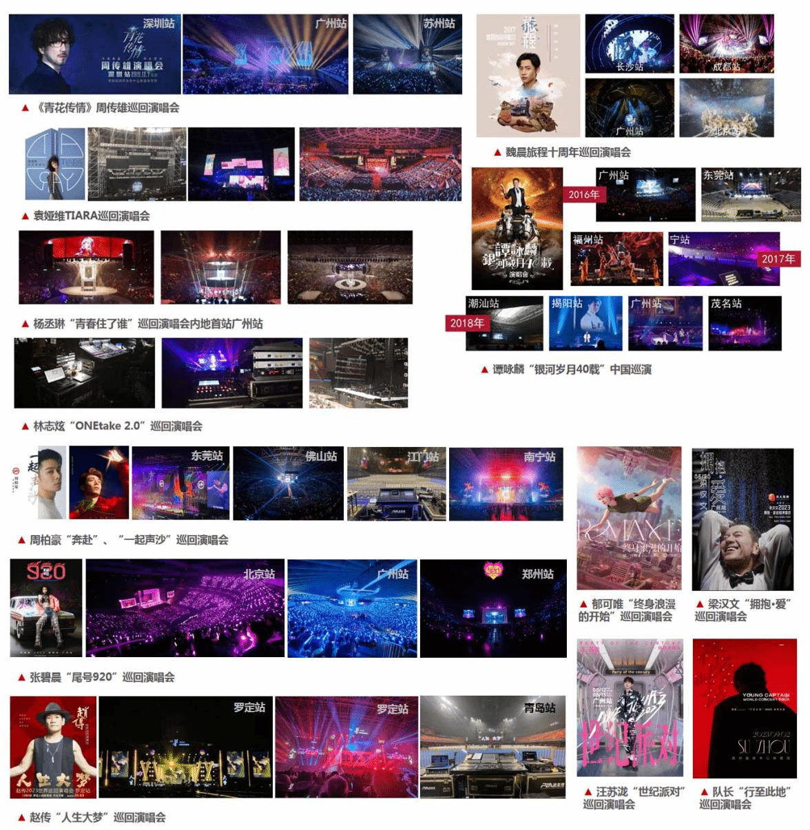 部分演出案例:《青花传情》周传雄巡回演唱会、袁娅维TIARA巡回演唱会、杨丞琳“青春住了谁”巡回演唱会、林志炫“ONEtake2.0”巡回演唱会、谭咏麟“银河岁月40载”巡回演唱会、周柏豪“奔赴”巡回演唱会、张碧晨“尾号920”演唱会、赵传“人生大梦”巡回演唱会、汪苏泷“世纪派对”巡回演唱会等。
