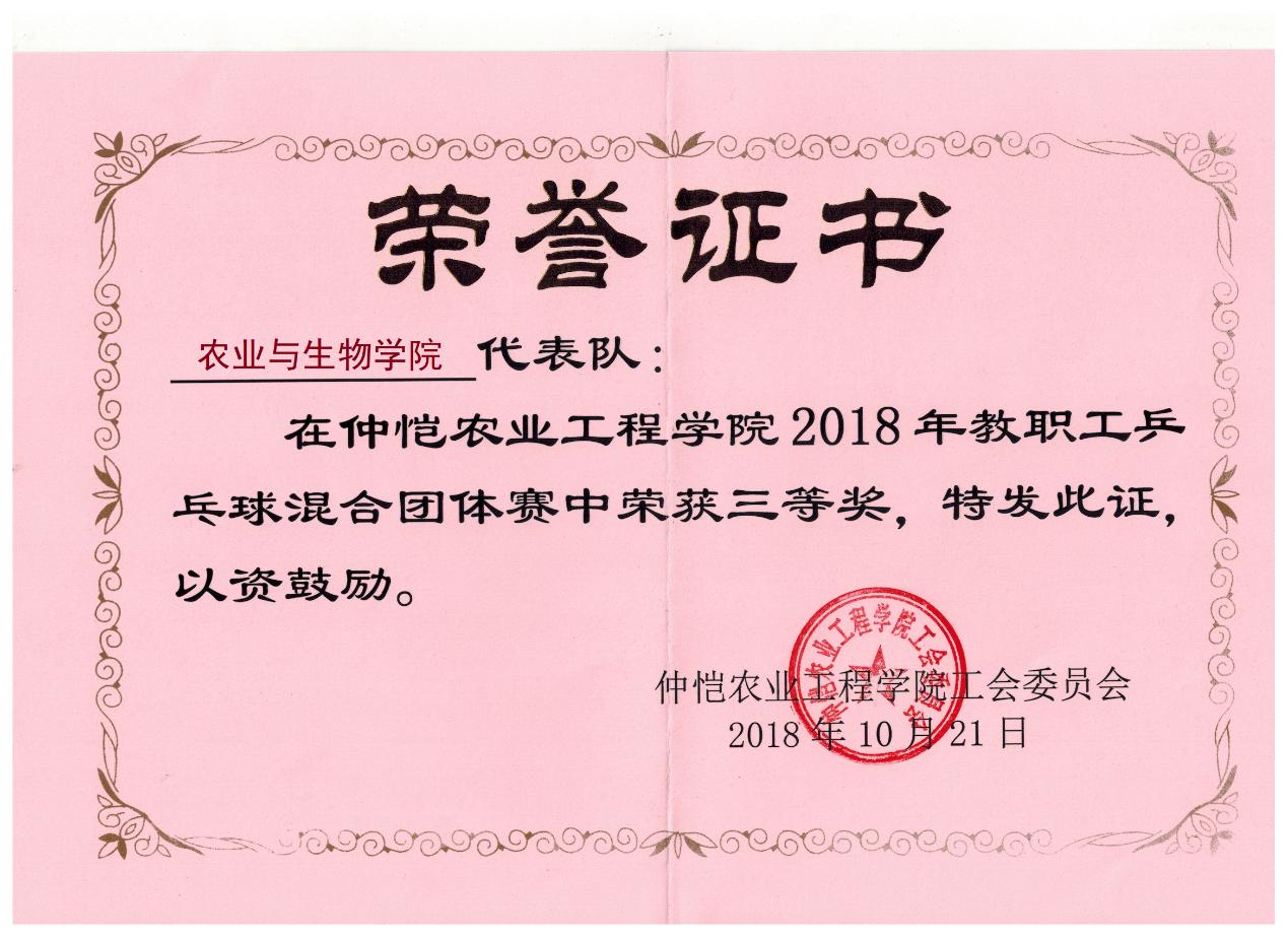 桂树飘香,稻田金黄,恰是一个丰收季。10月20-21日,在公司工会积极组织和工会主席梁佳勇的带领下,公司教工乒乓球队积极参加由公司工会组织的公司2018年教职工乒乓球混合团体赛。主力队员陈丹雄、万小荣、冯飞、罗梅、刘静、甘永红,替补队员梁佳勇,陈青春、余锋、游春平,队员们配合默契,表现出色,不负厚望,经过六轮激励角逐,斩获三等奖,获得了公司成立以来最好的成绩。经过此次比赛,既锻炼了身体,又促进了交流,打出了气势,赛出了风采。