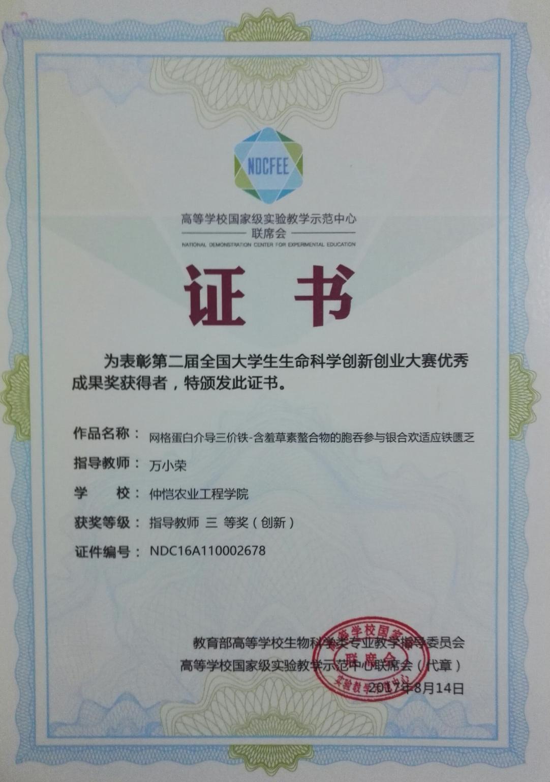 公司best365官网入口注册代表队首次参赛,由万小荣老师指导,张欣悦、邹婷和肖昉同学主持的项目《网格蛋白介导三价铁-含羞草素螯合物的胞吞作用参与银合欢适应铁匮乏》获得创新组全国三等奖,万小荣老师获得优秀指导教师奖,实现公司员工在生命科学类国家级大赛中的新突破。