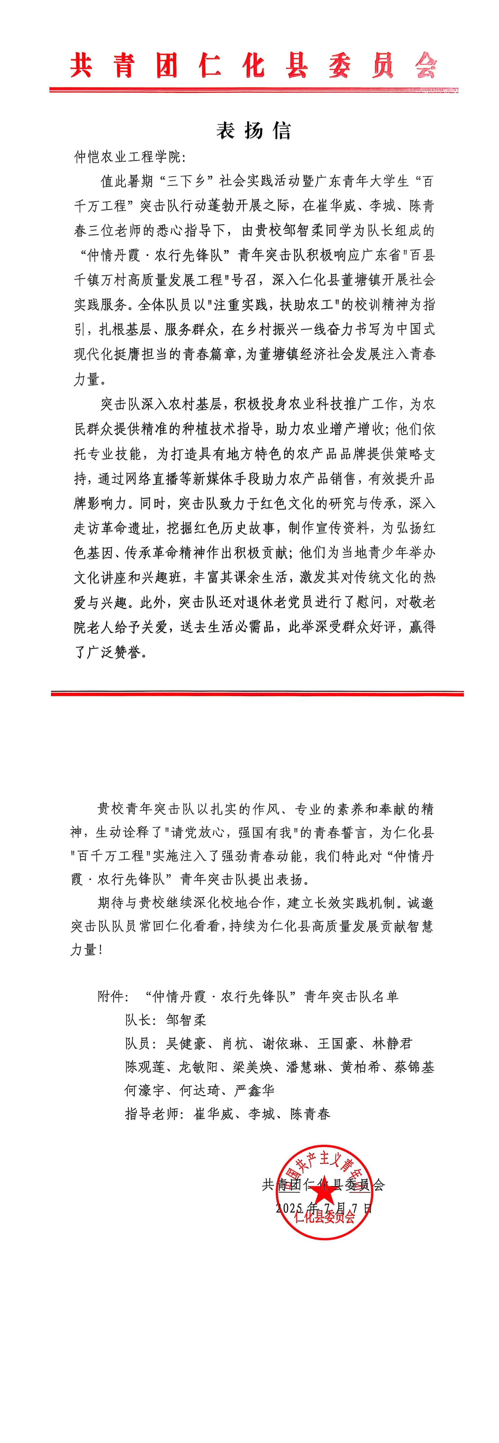 韶关市仁化县团委表扬公司三下乡队伍
