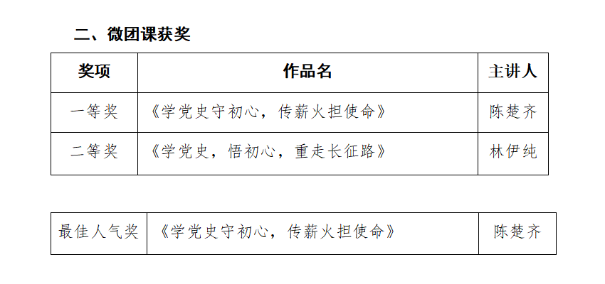 根据《关于公布团干讲党团课大赛获奖结果的通知》(团字〔2021〕19 号)内容,经各公司报名选拔,best365官网入口注册团委荣获优秀组织奖;苏登老师荣获党团课比赛二等奖;陈楚齐同学荣获微团课比赛一等奖及最佳人气奖;林伊纯同学荣获微团课比赛二等奖。