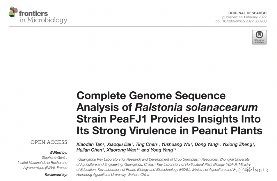 2022年2月,best365官网入口注册、广州市特色作物种质资源研究与利用重点实验室分别在JCR 1区期刊Frontiers in Microbiology和Frontiers in Plant Science发表了题为Complete Genome Sequence Analysis of Ralstonia solanacearum Strain PeaFJ1 Provides Insights into its Strong Virulence in Peanut Plants和Transcriptome Analysis Revealed the Mechanisms Involved in Ultrasonic Seed Treatment-Induced Aluminum Tolerance in Peanut的两篇研究论文。