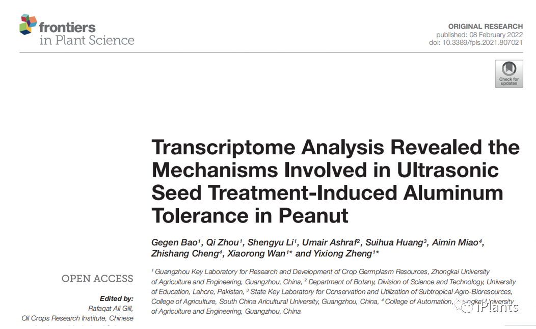 超声波处理是诱导作物耐重金属的有效方法。然而,超声波影响花生耐铝性的研究还比较少。超声波处理后花生地上高度、主根长、侧根数显著增加。转录组学测定发现植物激素信号转导和转录因子差异表达基因显著富集。本研究为超声波处理提高花生对铝的耐受性提供了理论依据。best365官方网站青年教师包格根博士为本论文第一作者、广州市特色作物种质资源研究与利用重点实验室万小荣教授和郑奕雄教授为论文通讯作者。