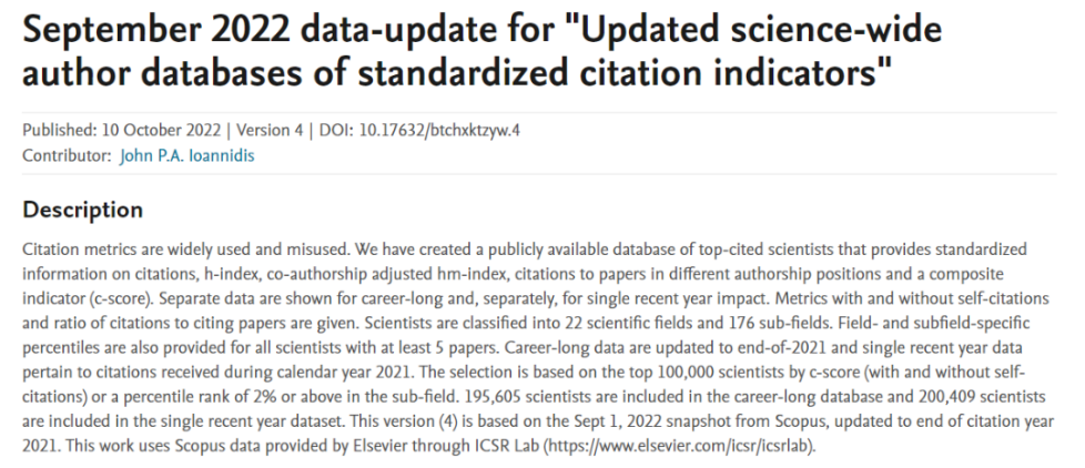 “全球前2%顶尖科学家榜单”由斯坦福大学John P. A. Ioannidis教授团队发布,该榜单基于Elsevier Scopus的数据,使用六种关键指标来进行打分,遴选出排名前2%的科学家。榜单分为“终身科学影响力排行榜”和“年度科学影响力排行榜”。