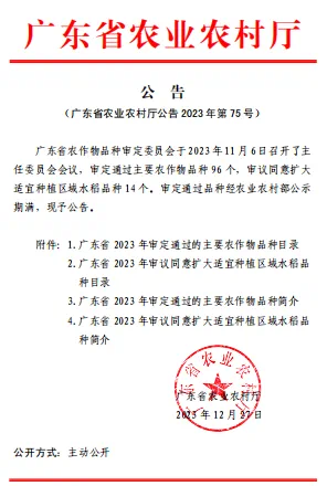 2023年12月27日,广东省农业农村厅发布关于广东省农作物品种审定结果的公告(广东省农业农村厅公告 2023 年第 75 号),公司best365官网入口注册、广州市特色作物种质资源研究与利用重点实验室、广东省玉米产业技术创新团队选育的糯玉米“仲糯6号”和甜玉米“仲甜10号”、“仲甜11号”分别通过广东省农作物品种审定委员会审定会议,审定编号分别为:粤审玉20230002,粤审玉20230010和粤审玉20230016,审定通过品种经农业农村部公示期满,现予公告。
