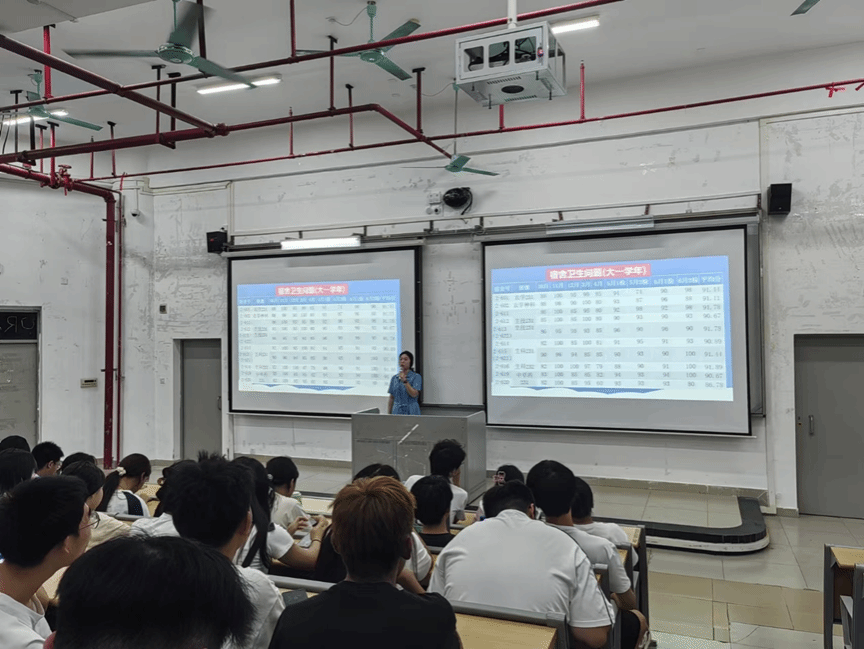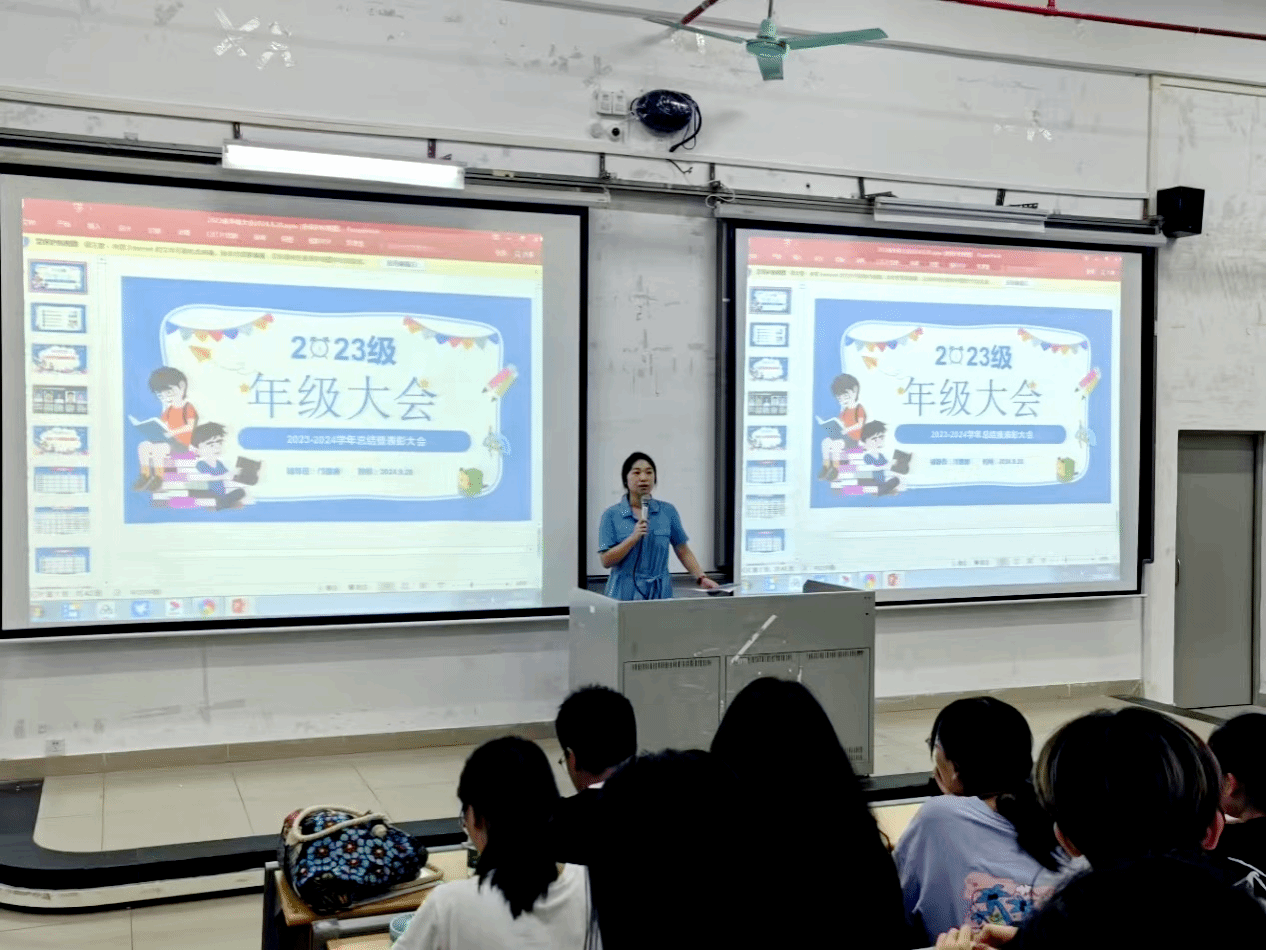 邝老师从各班专业课考试通过率、早读实施情况、宿舍卫生检查、入党积极性、获奖统计等各方面情况对23级各班在大一学年的整体表现进行了全面总结,通过详实的数据和生动的案例,展示了同学们在学科竞赛、文体活动等方面取得的累累硕果。她充分肯定了同学们在大一学年取得的各方面成绩,也指出了各班在不同方面存在的优势和不足,希望各班要认真总结并向表现优秀的班集体看齐,互相学习、取长补短、争先创优。在新学年里,她鼓励同学们要坚持晨跑和晨读,培养自律的良好习惯,提高自理和自立能力。同时,要继续保持积极向上的学习态度,勇于探索未知领域,不断提升和突破自我。