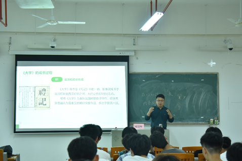 课上,喻国辉以“中国的四书分别是什么”为引子引出本次思政课的主题——学《大学》用《大学》。他从春秋战国各国之间纷争历史缓缓道来《大学》的成书过程,并从七个方面深入浅出地剖析了此书重要思想,让同学们对《大学》有更深刻地了解。他指出,“大学之道,在明明德,在亲民,在止于至善”是全书的核心,也是每个人应该追求的思想境界。