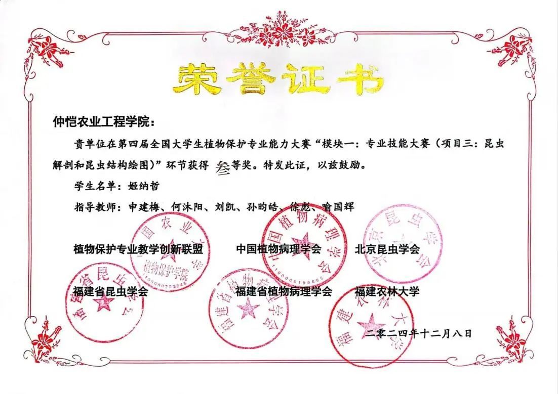 姬纳哲在“模块一:专业技能大赛(项目三:昆虫解剖和昆虫结构绘图)”环节中获得三等奖(指导老师:申建梅、何沐阳、刘凯、孙昀皓、徐彪、喻国辉)。
