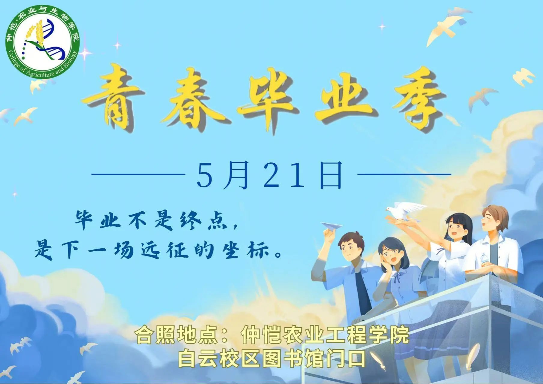 天空湛蓝,毕业的钟声回荡其中