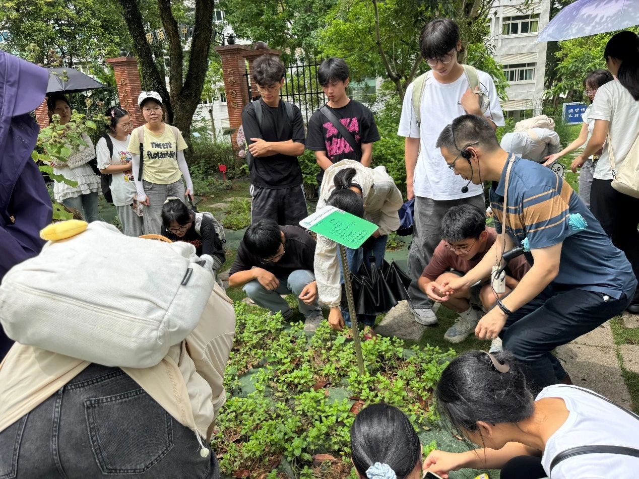 随后,一行人来到药王山。夏日的药王山,草木葱茏,各类药用植物争奇斗艳。广州中医药大学童老师以丰富的专业积累和生动的讲解,为同学们开启了一场药用植物的探秘之旅。在一株株药用植物前,童老师先详细介绍其鉴定特征,从叶片的形状、颜色,到花朵的形态、气味,再到根茎的纹理、质地,进行细致入微的剖析,面对形态相似的植物,童老师耐心教导同学们如何通过细微差别进行准确鉴别;此外,童老师还着重讲解了这些植物的入药部位和独特药效,有的药用植物不同的入药部位会产生完全不同的药效。同学们全神贯注,时而弯腰仔细观察植物的根茎,时而踮脚查看枝叶的生长形态,与童老师热烈互动,在实践中积累药用植物的鉴别经验。
