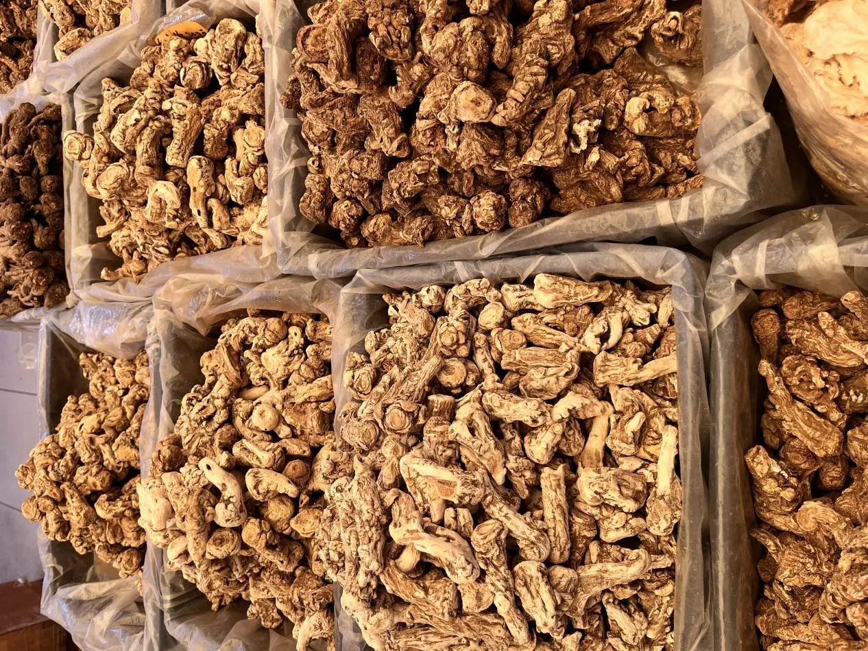 下午,实训团队转战华南地区规模最大的中药材专业市场——清平药材市场。作为国家商务部重点联系市场,清平市场日均交易量逾百吨,经营药材品种超5000种,是观察中药材流通环节的绝佳样本。同学们以5人小组为单位,依据《中药商品学》理论框架,从性状鉴别、道地产区溯源、市场价格波动、临床应用价值四个维度开展调研。